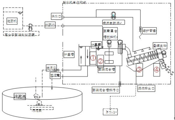 1、通過進泥泵將污泥輸送至計量槽流入到絮凝混合槽,多余的部分從溢流管回流到污泥池。濾液從排出口排出。