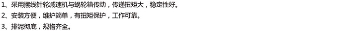 刮吸泥機(jī)主要由橋架、減速電機(jī)板、吸泥管、中心集泥槽、撇渣裝置鋼出水槽、出水堰板等作為配套輔件中心回轉(zhuǎn)支承、穩(wěn)流筒、框架鋼結(jié)構(gòu)、臂架、集泥刮就地控制箱等部件組成,并可將鋼制進(jìn)水柱管、不銹驅(qū)動(dòng)裝置采用蝸輪減速電機(jī),并內(nèi)置壓簧式過(guò)力矩保護(hù)機(jī)構(gòu);驅(qū)動(dòng)電機(jī)采用Y型電機(jī),電源為3P、380V、50HZ,防護(hù)等級(jí)IP55,F(xiàn)級(jí)絕緣;在工作時(shí),各吸泥管自成單元,吸泥濃度可通過(guò)設(shè)在中心集泥槽的流量調(diào)節(jié)閥控置就地控制箱為戶外型,不銹鋼外殼,雙層門(mén)密封,手動(dòng)和遠(yuǎn)程控制。