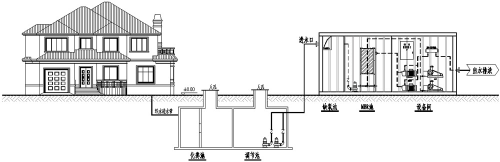 調(diào)節(jié)池內(nèi)設(shè)置提升泵,將污水自動(dòng)提升到BH-JZ型一體化污水處理設(shè)備中。